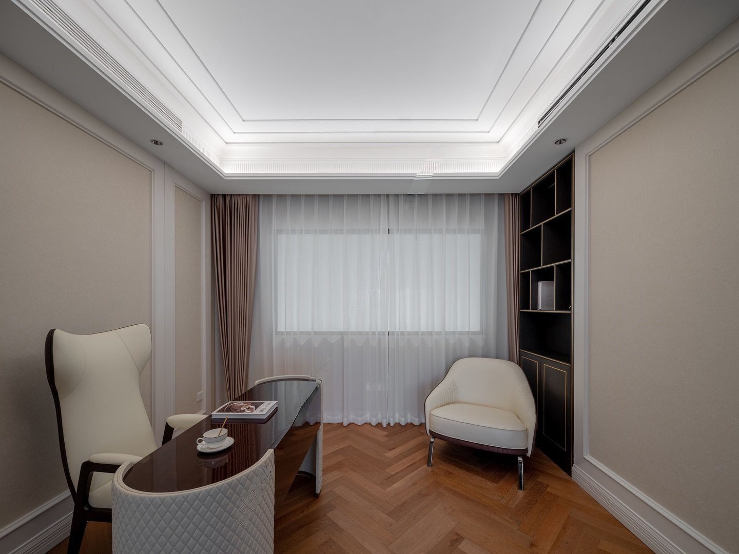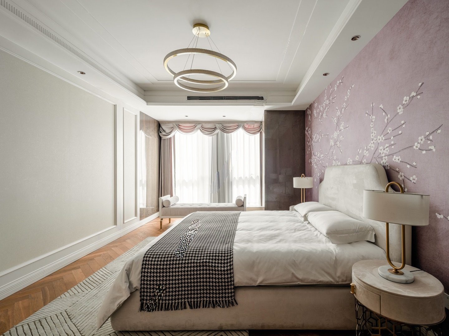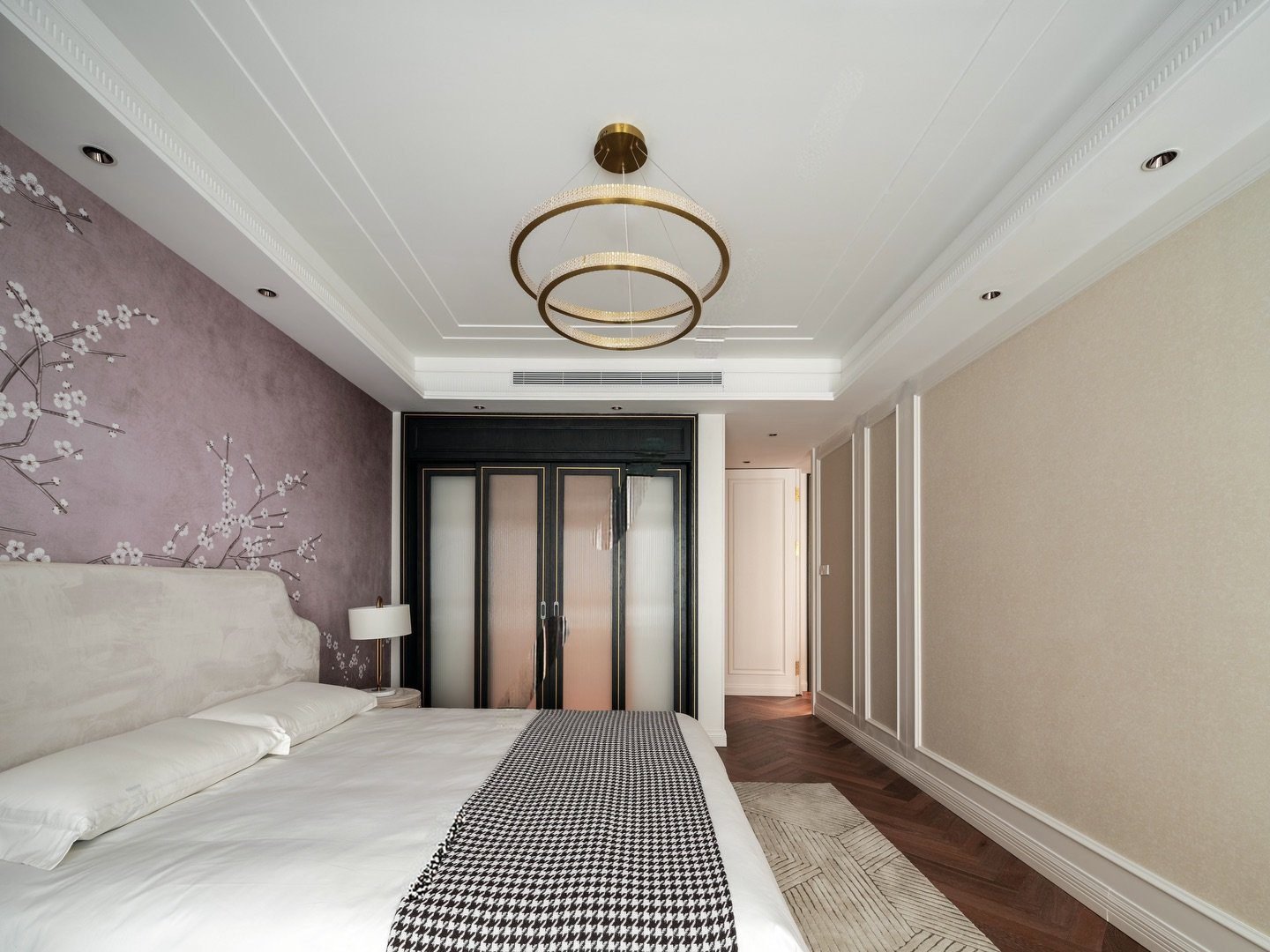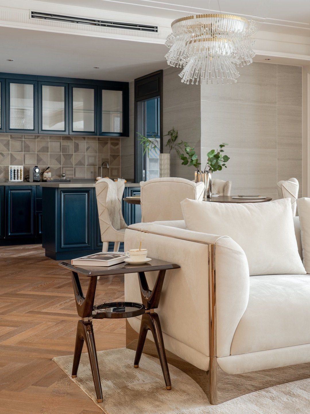 Sàn gỗ xương cá ấm áp làm nền cho tổng thể, mang đến cảm giác gần gũi và sâu lắng. Mỗi món đồ nội thất như được chọn lọc để kể một câu chuyện: về gu thẩm mỹ trưởng thành, về lối sống điềm tĩnh và về một chủ nhân hiểu rõ điều gì là đủ, là đẹp, là đáng sống.