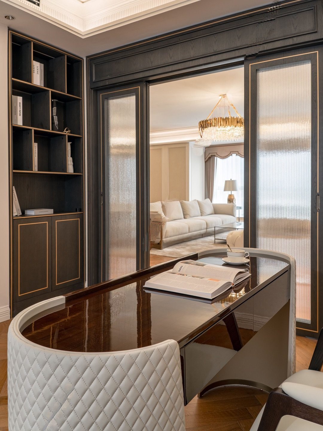 Không phô trương bằng những chi tiết cầu kỳ, Aurelia Maison chinh phục bằng sự kết hợp hài hòa giữa chất liệu tự nhiên và nét cổ điển tinh tế. Tường phào chỉ tối giản, ánh sáng dịu nhẹ và những điểm nhấn luxury như đèn pha lê, kim loại ánh đồng được tiết chế vừa đủ để không gian luôn thanh thoát, không bị “gượng sang”.