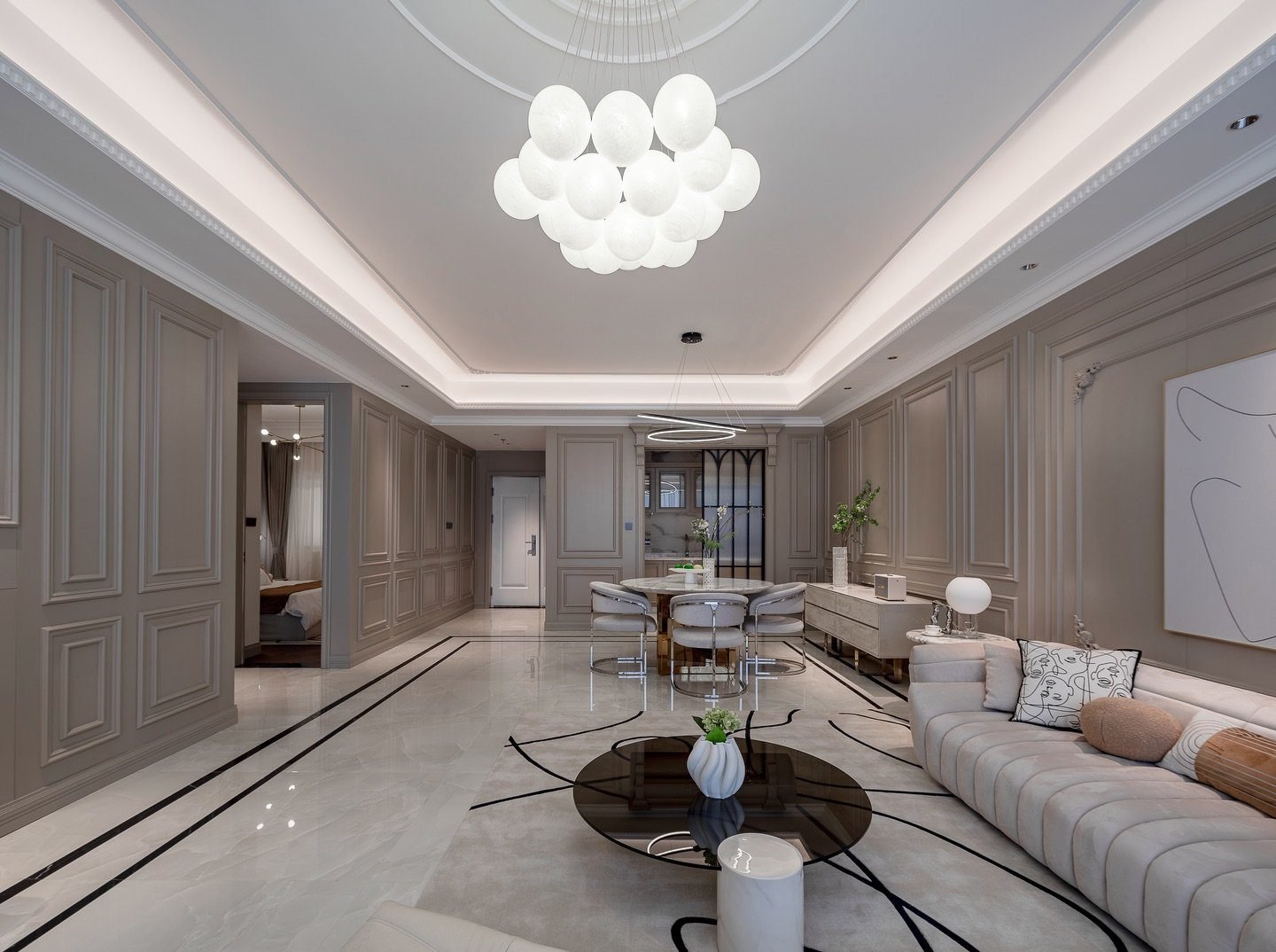 Velora Residence là nơi vẻ đẹp Tân cổ điển không còn bị ràng buộc trong những chi tiết nặng nề, mà thay vào đó được làm mới bằng gam màu kem nhẹ nhàng, ánh sáng phản chiếu khéo léo và bố cục mềm mại đầy nữ tính.